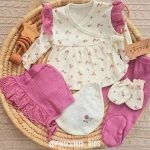 0 تا 3 ماه 👈 پنج تیکه،شامل بلوز مدل دراپه،شلوار جورابدار،پیشبند،دستکش،کلاه پرنسسی