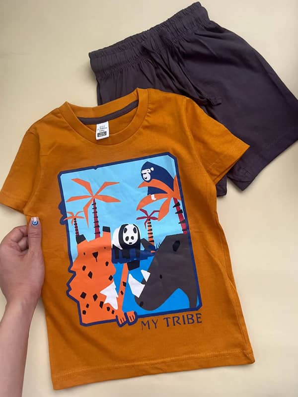 5 تا 6 سال👈قد تیشرت 46 پهنا 32 قد شلوارک 30 فاق شلوارک 24